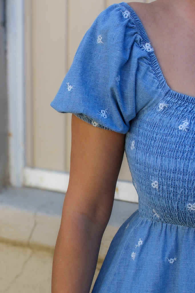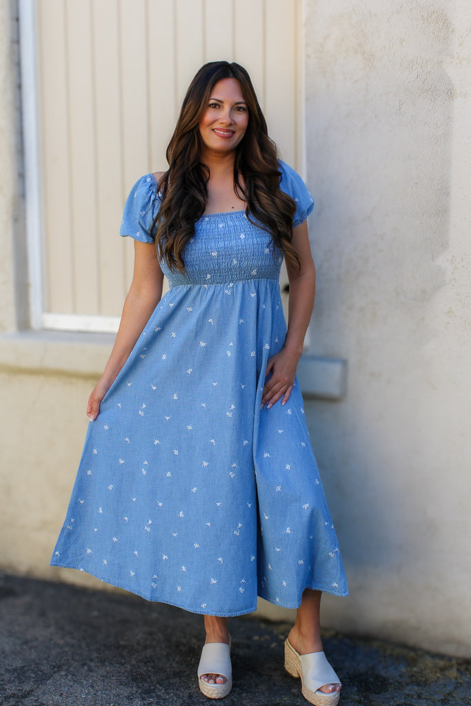Effortless charm meets timeless style with the Celina Denim Midi Dress. This midi features a flattering square neckline and short puff sleeves that frame the shoulders beautifully. The smocked bodice creates a fitted silhouette that flows into an elegant A-line skirt, while delicate floral embroidery adorns the classic denim pattern.