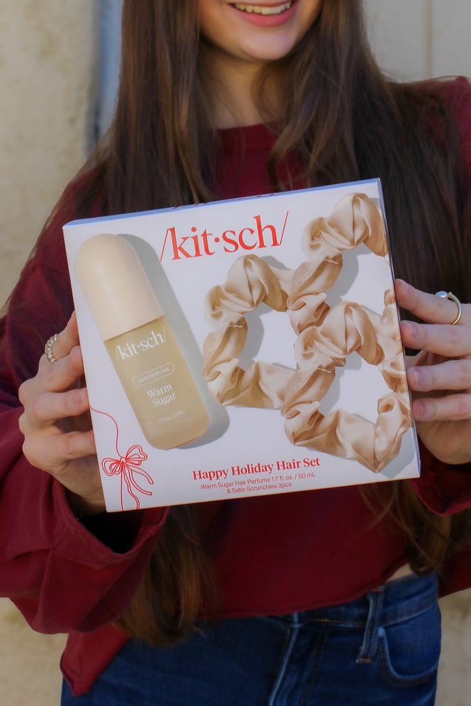 Wrap yourself in cozy holiday vibes with the Kitsch Happy Holiday Hair Set – Warm Sugar. Featuring a luxurious hair & body mist, this scent blends vanilla, sweet sugar, and pink grapefruit for a warm, indulgent finish that lingers just the right amount. Infused with patented odor-neutralizing technology, it refreshes your hair, body—even your Kitsch Satin Pillowcase—between washes.