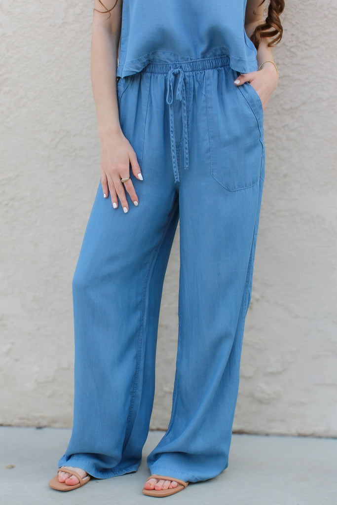 Take your comfort to the next level with our Lane Chambray Pants! These high-waisted lounge pants feature a drawstring detail and an elasticized waist for the perfect fit. With pockets for convenience and a wide-leg design, these chambray pants are both stylish and practical. Made with 100% lyocell fabric, you'll stay cool and comfortable all day long. Don't forget to pair with the Lane Button Back Blouse.