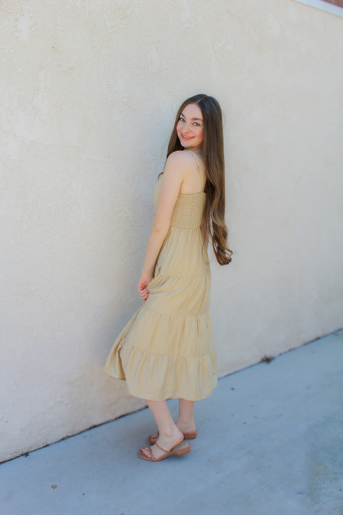 Effortless elegance meets everyday practicality in the Wesley Midi Dress. This sleeveless tiered design features a functional button front and adjustable straps for a customizable fit. Hidden side pockets add convenience without compromising the silhouette. Perfect for transitional seasons and versatile enough to dress up or down.