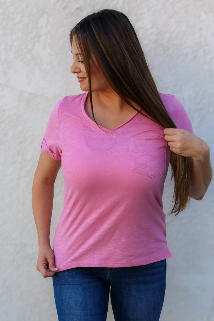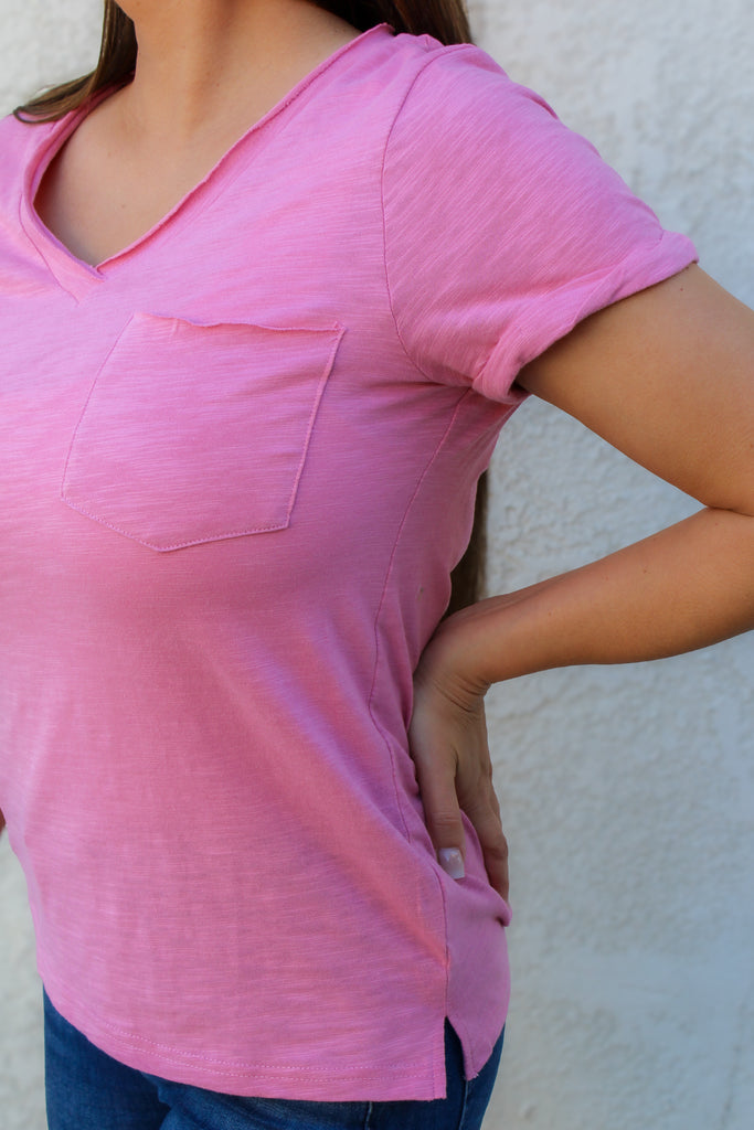 Effortless style meets comfort in this berry pink slub top. The relaxed v neckline and soft, breathable fabric make it perfect for everyday wear, while the raw edge detailing adds modern edge. A functional chest pocket keeps essentials within reach. Layer it or wear solo—this versatile piece transitions seamlessly from casual to put-together.