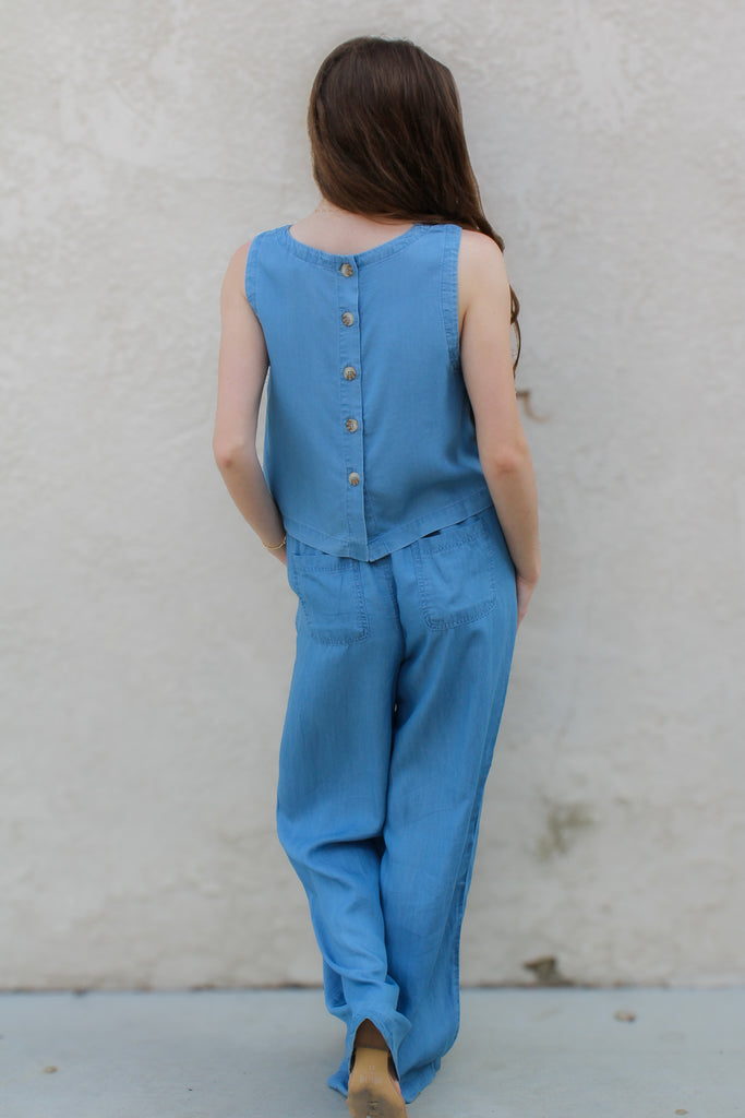 Button up the Lane Button Back Blouse for effortless style. This lightweight chambray blouse features functional buttons down the back, while pairing perfectly with the Lane Pants for a matching look. Add a touch of charm to your wardrobe today!