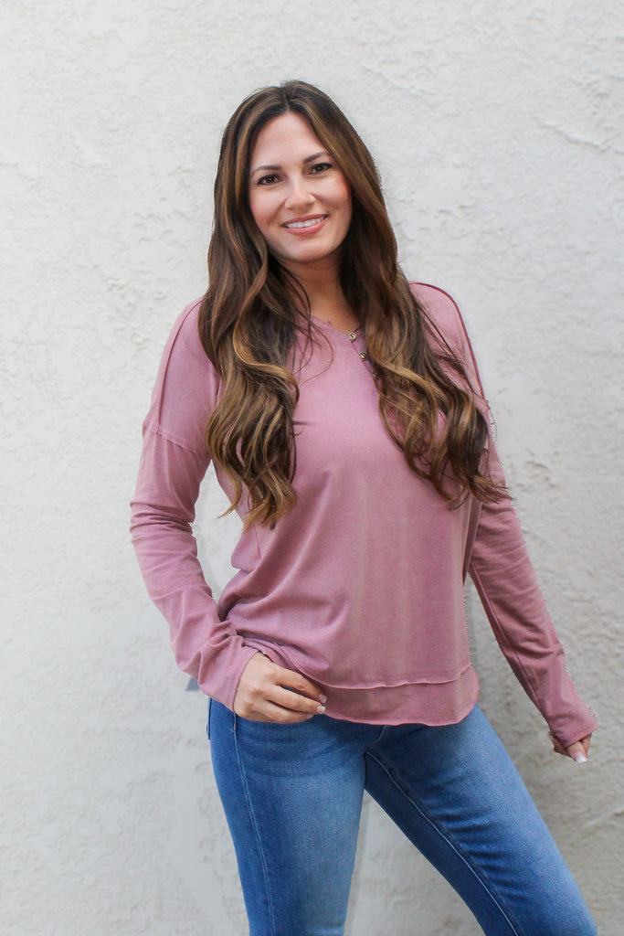Slip into effortless style with the Cindy Henley Long Sleeve, featuring a gorgeous plum hue that's anything but ordinary. The mineral-washed fabric gives it that perfectly lived-in, relaxed vibe—soft, comfortable, and ready for whatever your day throws at you.